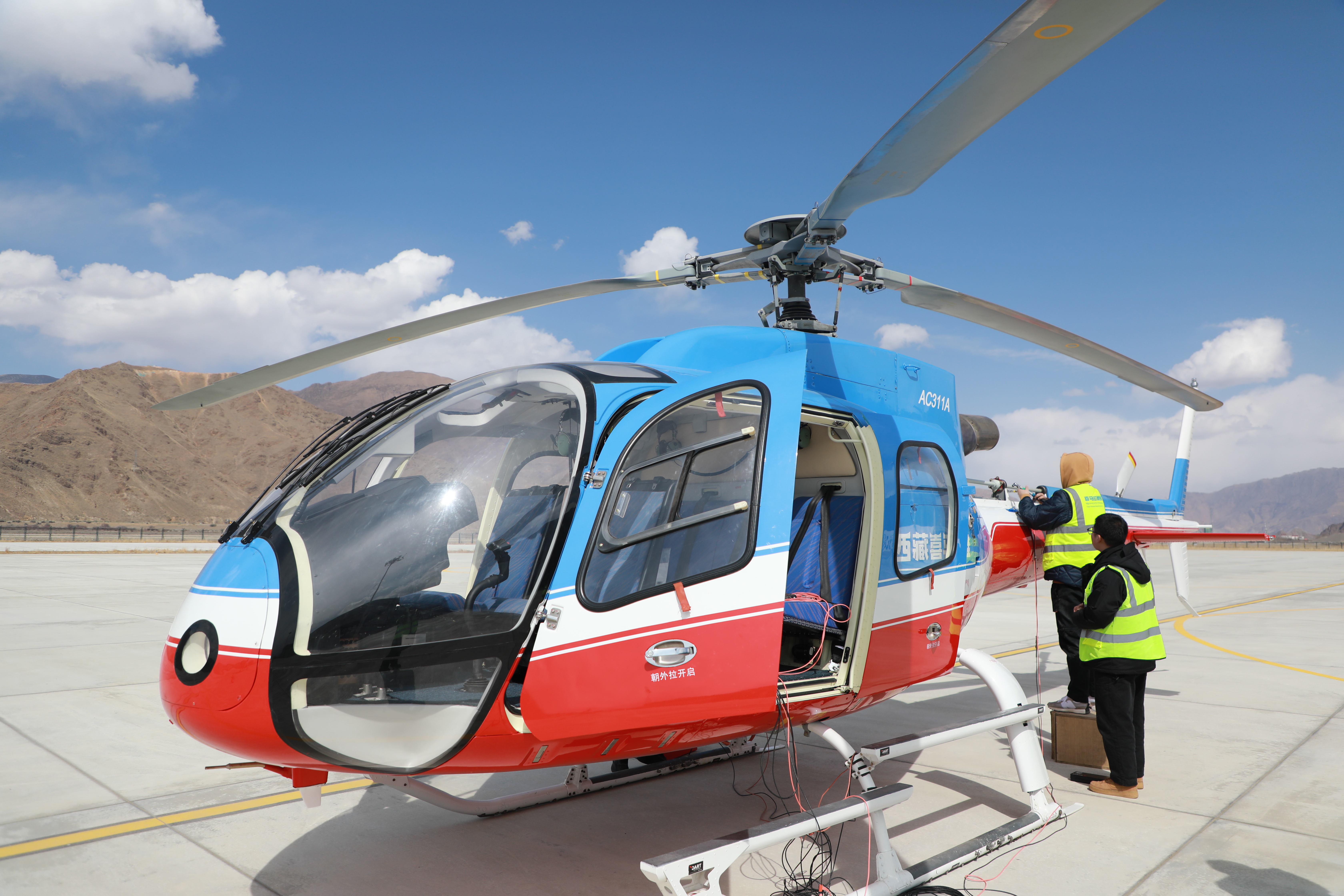 当天,AC311A直升机从海拔高度3680米的朋康机场腾飞,腾飞重量为1865千克,先沿京藏公路航行,后沿省道304公路航行20公里到起降点,全程约120公里。到海拔4450米起降点后,直升机先后三次着陆,每次着陆增添一名地面职员上机,直升机最大腾飞重量抵达2010千克。