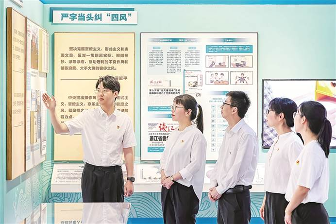 党的十八大以来,我们党一直推进党的政治建设、头脑建设、组织建设、作风建设、纪律建设,把制度建设贯串党的各项建设,开展史无前例的反糜烂斗争,在构建周全从严治党系统上积累了富厚效果。图为克日,浙江省淳安县纪委监委干部在省纲纪教育基地旅行周全从严治党成绩展。谢航凯 摄